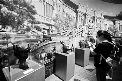 進(jìn)入序章“圓明夢歸”單元,首先映入眼簾的是六件獸首銅像,在圓明園景觀背景板映襯下顯得莊嚴(yán)而又肅穆。圓明園獸首銅像原為圓明園海晏堂十二生肖噴泉構(gòu)件,1860年英法聯(lián)軍劫掠圓明園后流失海外。展覽現(xiàn)場不僅展出了回歸祖國懷抱的牛首、虎首、猴首、豬首、鼠首、兔首,還同時展出了十二生肖獸首銅像的仿制品,用這種方式讓它們實現(xiàn)了“團(tuán)圓”。以圓明園獸首銅像由散到聚的今昔對照為引線,展覽折射出中華民族從屈辱危亡走向復(fù)興的歷史進(jìn)程。