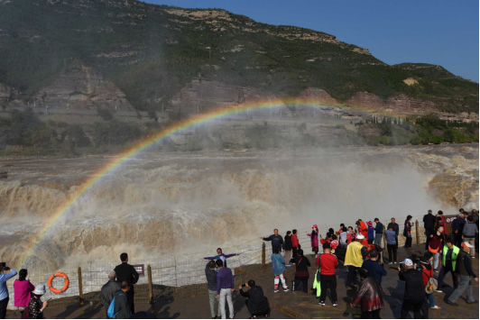 ●22日,眾多游客在山西臨汾吉縣黃河壺口瀑布景區(qū)欣賞“彩虹橋”美景。