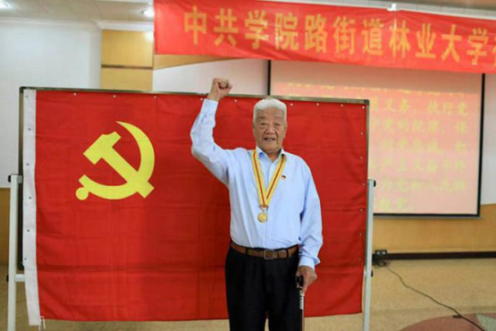 ●支部里年齡最大的新黨員!?9月21日,在北京市海淀區(qū)學(xué)院路街道黨工委和北京林業(yè)大學(xué)社區(qū)黨總支的見(jiàn)證下,102歲抗戰(zhàn)老兵張守中宣誓入黨。