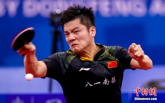 10月21日晚,第七屆世界軍人運(yùn)動會乒乓球男子團(tuán)體決賽在湖北省武漢市舉行,中國隊以3比1戰(zhàn)勝朝鮮隊獲得乒乓球男子團(tuán)體冠軍。圖為中國隊樊振東在比賽中。中新社記者 張暢 攝