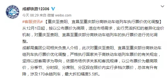 成都局集團公司:對重慶至貴陽、宜昌至重慶部分高鐵動車組列車執行票價優化調整,總體有升有降,涉及170余趟列車,最大折扣幅度5.5折。