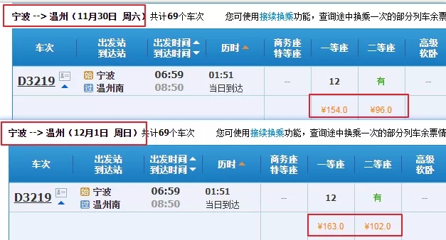 比如目前買11月30日寧波開往溫州南最早一班的D3219次,二等座票價96元,一等座154元,而12月1日這趟車票價調整為了二等座102元,一等座163元。