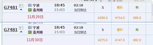 11月29日寧波開往溫州南的G7481次,二等座96元,一等座154元,商務座288元,調價后,11月30日和12月1日,這趟車二等座只要92元,一等座147元,商務座275元,稍微便宜了一些。
