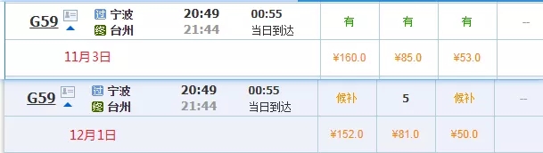 又如寧波到臺州,每晚8點49分的G59次,目前票價是二等座53元,一等座85元,商務座160元,調價后,二等座50元,一等座81元,商務座152元。