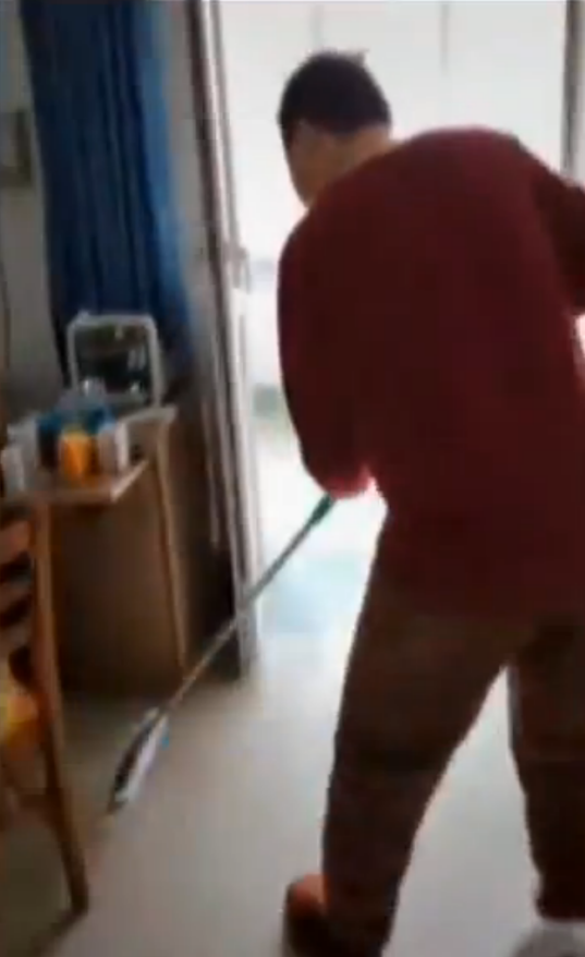 上海援鄂醫療隊的醫護人員拍攝了一段小視頻,正在拖地的小伙子并不是工作人員,而是一名剛剛治愈的患者。