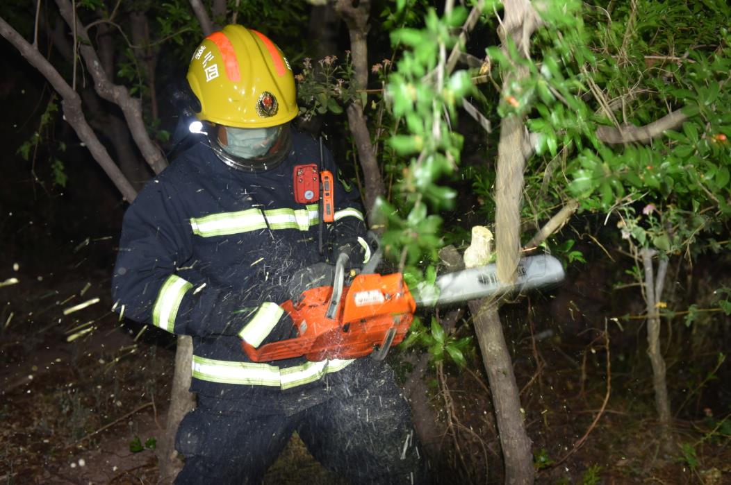 隨著火勢加大,22點(diǎn)45分,聯(lián)防指揮部增派6臺消防車,上百名消防指戰(zhàn)員到站,消防指戰(zhàn)員迅速在海南加油站背后借助機(jī)動鏈鋸等工具砍伐樹木,迅速建立15米寬的隔離帶,并架設(shè)2個水槍陣地,對周圍植被進(jìn)行進(jìn)行增濕防燃。