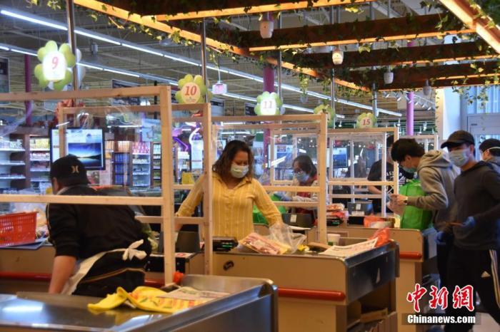 資料圖:當(dāng)?shù)貢r(shí)間4月6日,美國(guó)大華府地區(qū)的一家超市在結(jié)賬區(qū)收銀員和顧客之間設(shè)置玻璃隔斷,防止互相傳染。 中新社記者 沙晗汀 攝