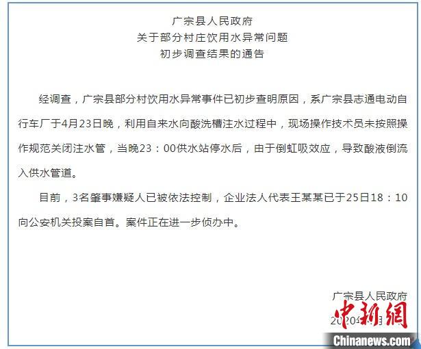 中新網(wǎng)邢臺(tái)4月25日電 (張鵬翔 李鐵錘)針對(duì)廣宗縣廣宗鎮(zhèn)部分村莊飲用水異常一事,河北省廣宗縣宣傳部微信公眾號(hào)“廣宗發(fā)布”25日晚間通報(bào)稱,經(jīng)查,事故原因系廣宗縣志通電動(dòng)自行車廠技術(shù)人員違規(guī)操作,未關(guān)閉水管,由于晚間停水,水管產(chǎn)生倒虹吸效應(yīng),導(dǎo)致酸液倒流入供水管道。目前,3名肇事嫌疑人已被依法控制,企業(yè)法人代表王某某已向公安機(jī)關(guān)投案自首,案件正在進(jìn)一步偵辦中。