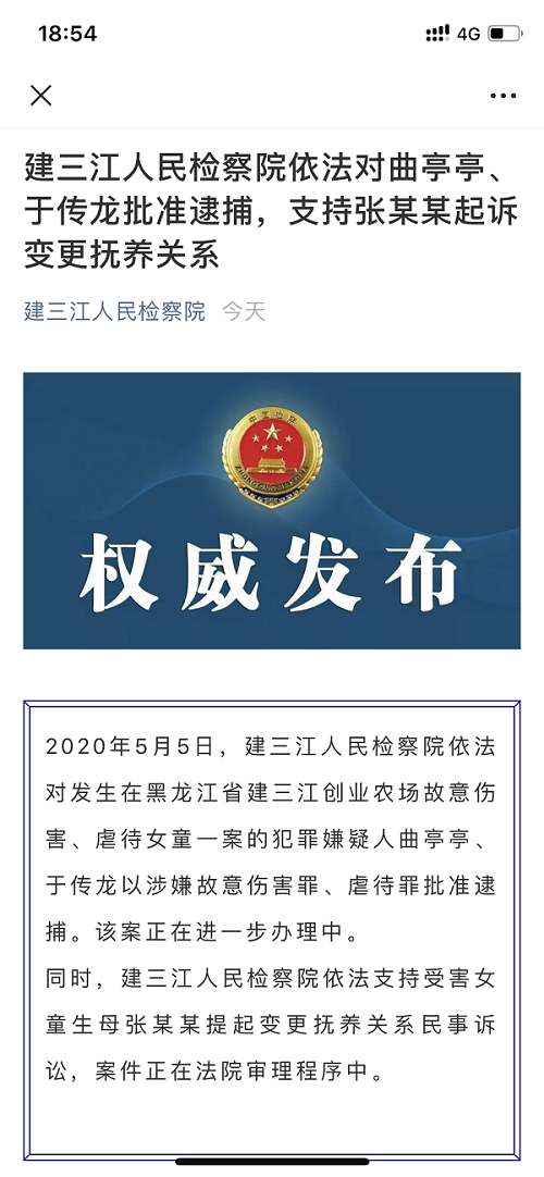 2020年5月5日,建三江人民檢察院依法對發(fā)生在黑龍江省建三江創(chuàng)業(yè)農(nóng)場故意傷害、虐待女童一案的犯罪嫌疑人曲亭亭、于傳龍以涉嫌故意傷害罪、虐待罪批準(zhǔn)逮捕。該案正在進(jìn)一步辦理中。