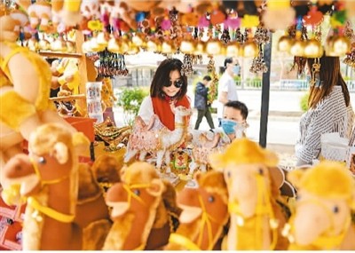 “五一”假期,甘肅省敦煌市在做好疫情防控的前提下,有序開放部分旅游場所。圖為在敦煌市鳴沙山月牙泉景區門口,游客們正在挑選當地特色小商品,歡度假日。侯崇慧攝(人民視覺)