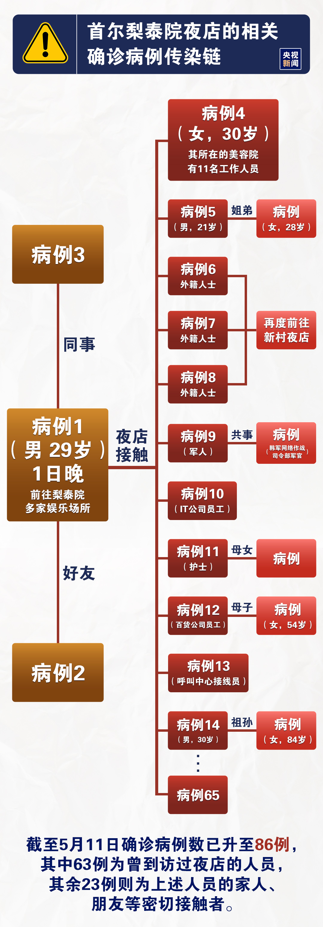 根據(jù)最新通報(bào),目前與首爾梨泰院夜店相關(guān)的新冠肺炎確診病例數(shù)已升至86例,其中63例為曾到訪過(guò)夜店的人員,其余23例則為上述人員的家人、朋友等密切接觸者。央視新聞綜合已知信息,梳理出原梨泰院事件集體感染鏈: