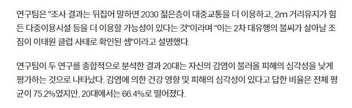 韓國(guó)的一項(xiàng)調(diào)查顯示,20—30歲的年輕人可能會(huì)更多地使用大眾交通工具,也難以保持2米的安全距離。此外,認(rèn)為“新冠肺炎會(huì)對(duì)健康產(chǎn)生嚴(yán)重影響”的民眾平均占比約75.2%,但在20多歲的年齡段中,這個(gè)比例只有66.4%。