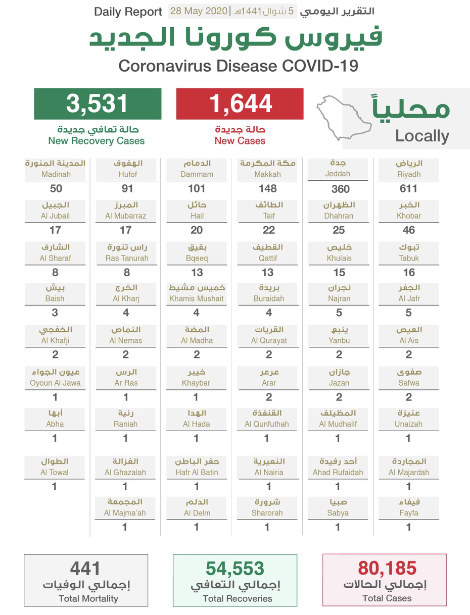 △沙特截至5月28日疫情情況(圖片來源:沙特衛生部)