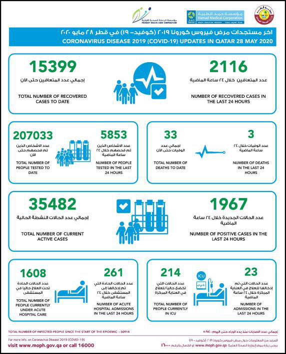 卡塔爾新冠病毒疫情持續增長,單日新增確診病例和單日治愈病例雙雙創新高,同時疫情發生以來,單日治愈病例數首次超過當日確診數??ㄋ柟残l生部5月28日下午對外公布,在過去的24小時中,共進行了5853例新冠病毒肺炎測試,確診1967例,累計確診病例達50914例。當天卡塔爾還新增3例死亡病例,死者分別為81歲、50歲和25歲,生前均患有慢性疾病,全國累計死亡病例達33例。此外,卡塔爾當天還有2116名治愈患者,總治愈人數達15399例,目前仍有35482人處于治療中,其中1608人住院治療,214人在重癥監護室中。卡塔爾累計進行了207033例新冠病毒測試,確診人數約占總檢測人數的四分之一。