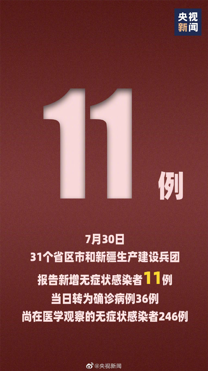31個省(自治區(qū)、直轄市)和新疆生產(chǎn)建設(shè)兵團報告新增無癥狀感染者11例(境外輸入5例);當日轉(zhuǎn)為確診病例36例(無境外輸入);當日解除醫(yī)學觀察9例(境外輸入2例);尚在醫(yī)學觀察無癥狀感染者246例(境外輸入93例)。
