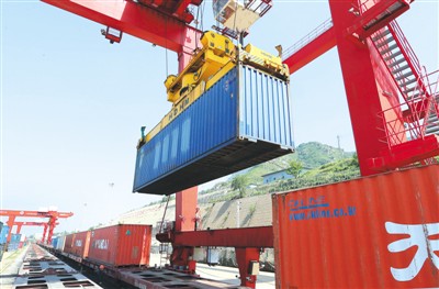 中哈(連云港)物流合作基地是江蘇連云港自貿區港口區塊里的一張亮麗名片。截至今年5月中旬,該基地今年到發中歐班列突破1萬車。圖為大型機械正在吊裝集裝箱。王健民攝(人民視覺)