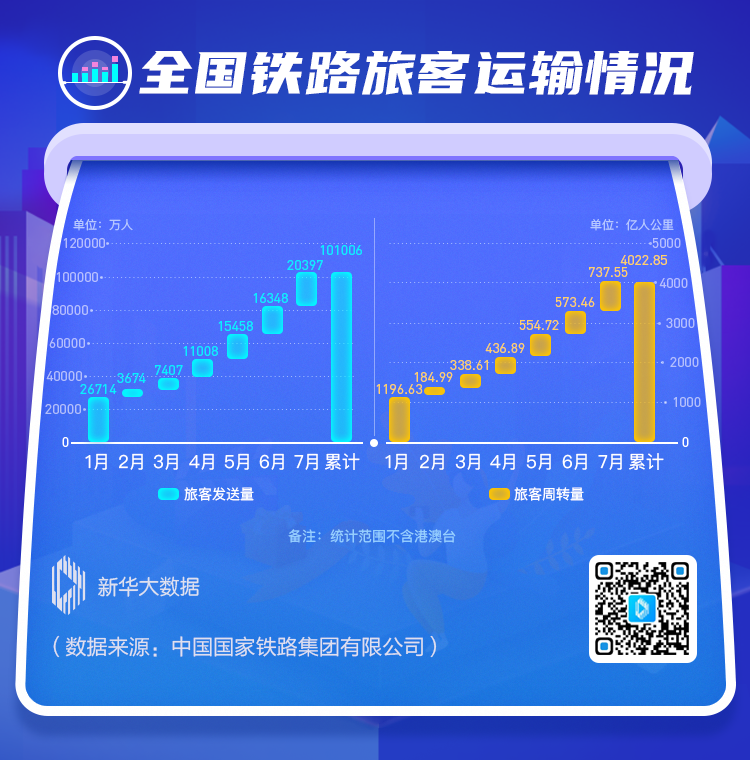 火車作為主要出行交通工具之一,極大地方便了人們的日常生活。恰逢今年國慶節(jié)與中秋節(jié)重合,足足8天的假期,預計鐵路客流量將有明顯增長。據(jù)中國鐵路總公司發(fā)布的數(shù)據(jù),今年5月開始,旅客發(fā)送量呈大幅增長態(tài)勢,到7月末,全國鐵路累計發(fā)送旅客101006萬人。除此之外,旅客周轉(zhuǎn)量也在逐漸增加,截至7月,全國旅客中轉(zhuǎn)量累計4022.85億人公里。