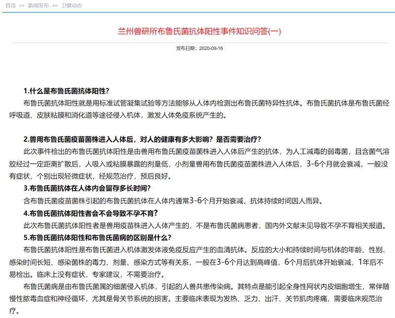 16日,蘭州市衛健委專門在官方網站上針對受影響群眾的疑問做出回答,強調布魯氏菌抗體陽性和布魯氏菌病是有區別的,前者是細菌進入機體激發體液免疫反應產生的血清抗體,一般在3-6個月達到高峰值,6個月后抗體不易檢出,臨床上沒有癥狀,不需要治療。