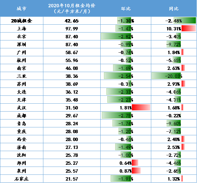 表:全國大中城市2020年10月份租金均價(jià)及同環(huán)比變化幅度