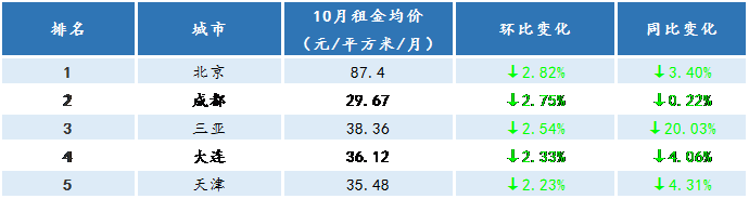 從環(huán)比跌幅TOP5城市來看,10月份租金跌幅前5城市分別是北京、成都、三亞、大連、天津。北京受到疫情反復(fù)的影響,加上現(xiàn)階段進(jìn)入行業(yè)淡季,市場(chǎng)活躍度呈現(xiàn)持續(xù)下降趨勢(shì)。三亞隨著邁入旅游淡季,租賃需求減弱,租金水平明顯下滑。