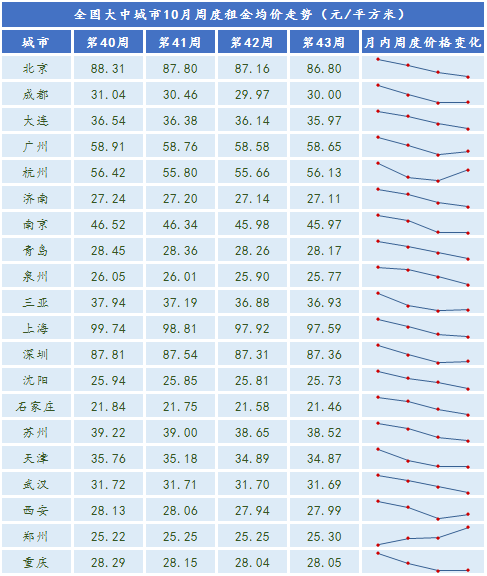 報(bào)告稱,10月,全國大中城市租金掛牌均價(jià)為42.65元/平方米/月,環(huán)比下降1.3%,同比下降2.48%,環(huán)比降幅較上月擴(kuò)大1.25個(gè)百分點(diǎn)。各等級(jí)城市租金水平均呈現(xiàn)下滑態(tài)勢(shì),行業(yè)淡季之下市場(chǎng)活躍度顯著下降。