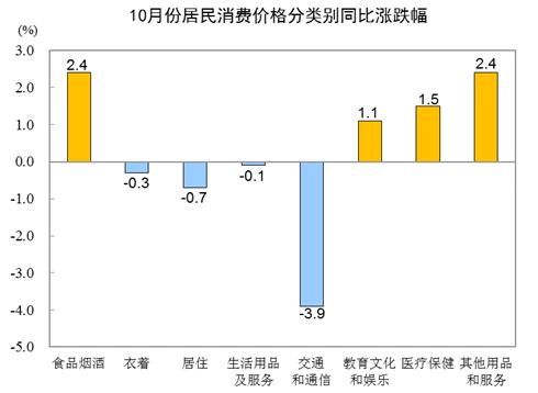10月份,全國居民消費(fèi)價(jià)格環(huán)比下降0.3%。其中,城市下降0.3%,農(nóng)村下降0.5%;食品價(jià)格下降1.8%,非食品價(jià)格上漲0.1%;消費(fèi)品價(jià)格下降0.6%,服務(wù)價(jià)格上漲0.1%。