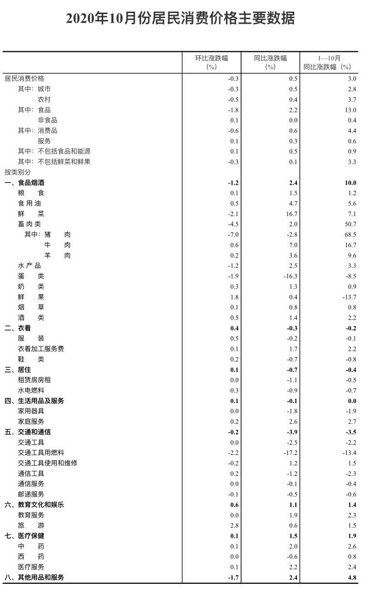 國家統(tǒng)計(jì)局:2020年10月份居民消費(fèi)價(jià)格同比上漲0.5% 漲幅比上月回落1.2個(gè)百分點(diǎn)