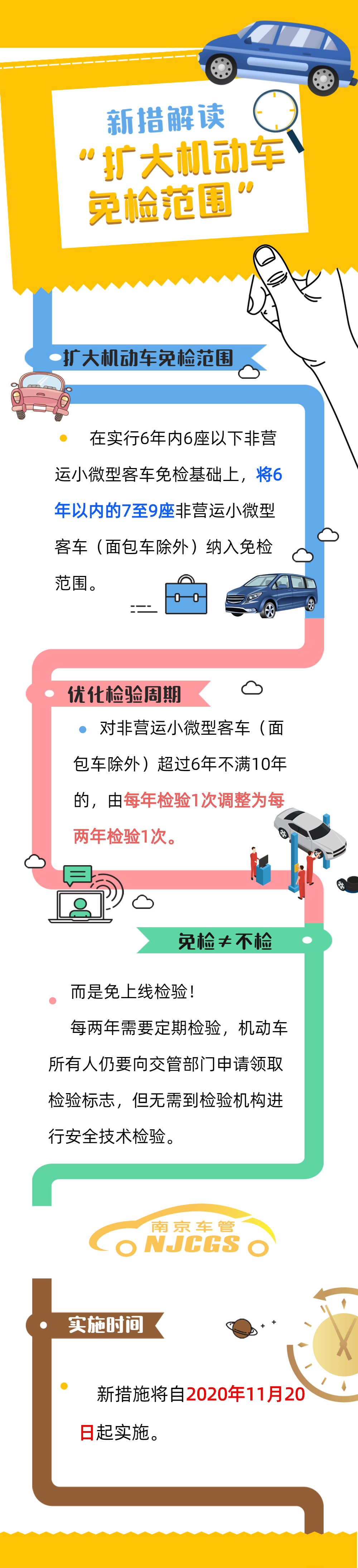 12項“放管服”改革優(yōu)化營商環(huán)境新舉措將在11月20日生效。其中,關于“擴大機動車免檢范圍”的新措施備受大家關注。不少車主也提出了疑問,我的車到底在不在免檢范圍內?新政中“免檢”意思是不用檢驗了?我的車能享受到新措施“福利”嗎?......南京車管所為此專門制作了小微型客車檢驗周期表,車主們速收藏!