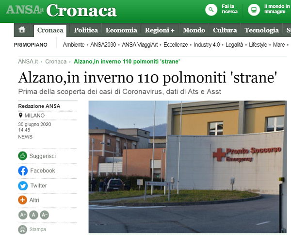 6月30日,根據當地媒體報道,意大利貝爾加莫省衛生醫療機構的統計數據顯示,去年冬天共收治了110例“奇怪”的肺炎病例。時間又推進到去年11月。