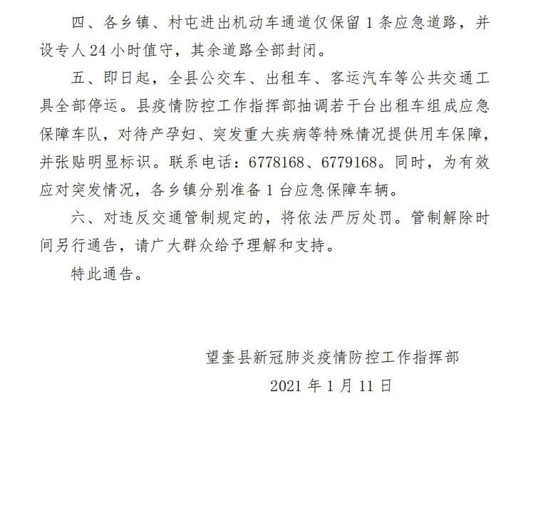 2021年1月11日,總臺央視記者從黑龍江省綏化市望奎縣新冠肺炎疫情防控工作指揮部獲悉,為堅決防止新冠肺炎疫情擴散蔓延,縣疫情防控工作指揮部決定在縣域范圍內(nèi)實施道路交通管制。現(xiàn)將有關(guān)事項通告如下: