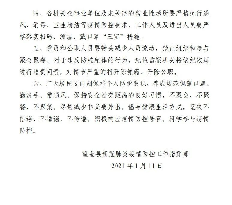 三、全縣城鄉(xiāng)居民自即日起,無特殊情況不得離開望奎。如特殊情況確須出行的,需嚴(yán)格執(zhí)行請示報告及相關(guān)健康管理制度,經(jīng)縣疫情防控工作指揮部同意后,方可出行。