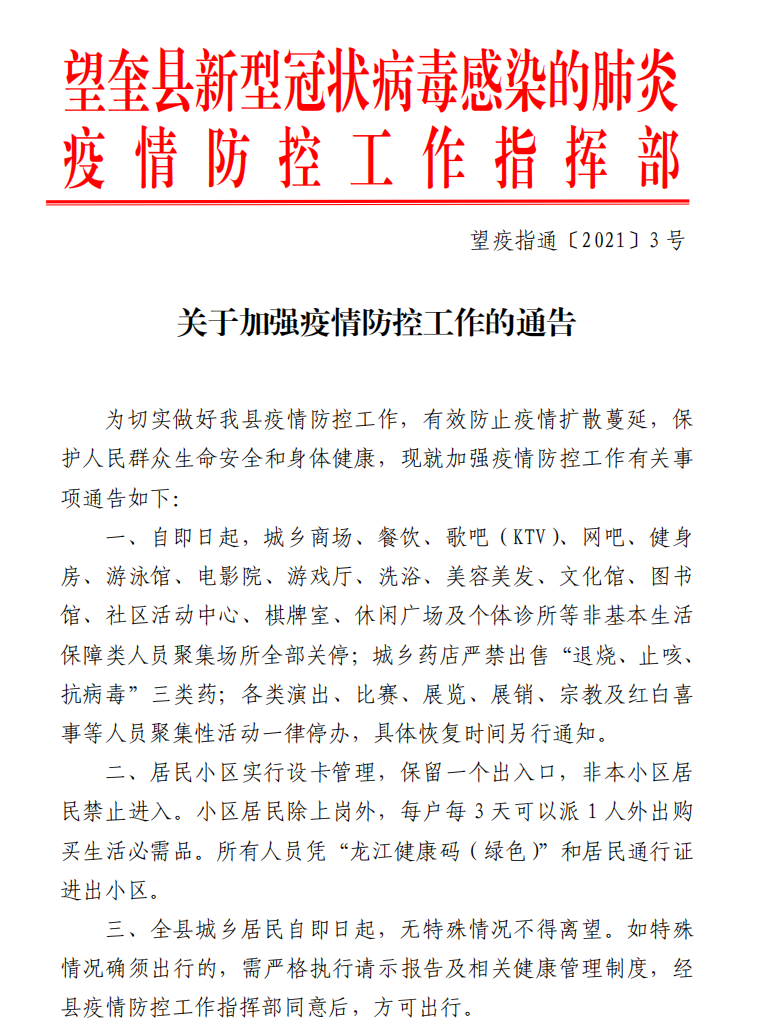 同日,總臺央視記者從黑龍江省綏化市望奎縣新冠肺炎疫情防控工作指揮部獲悉,為了有效防止疫情擴散蔓延,加強疫情防控工作,指揮部對有關(guān)事項通告如下: