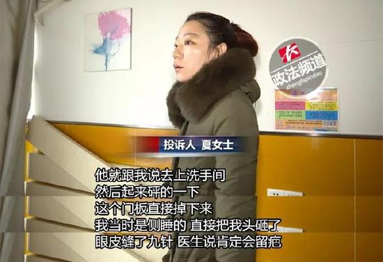 夏女士的左眼眼角被劃出了一道3公分長的口子,頓時血流不止,定了定神之后她才發現,原來是位于床正上方的裝飾木板垮塌了。夏女士受傷后,被送到了醫院搶救,醫生給她做了縫合處理。