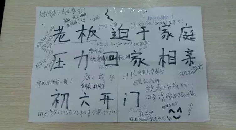 春節回家,意味著團圓,但對于一些單身男女來說,他們回家過年還有一個很重要的任務,那就是相親。前幾天,在朋友圈里瘋傳的桂林市一家店鋪“老板迫于家庭壓力,回家相親,初六開業”的歇業告示就引起了大家的共鳴,很多人還在告示上寫下了給店主的祝福語。