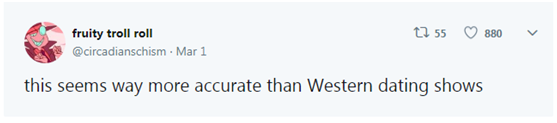 報道稱,把這些截圖搬到推特上的,是一位名叫Bobby Sun的來自倫敦的用戶,他在特的推文里寫道:中國的這檔相親綜藝節目“極其地貼近生活”。