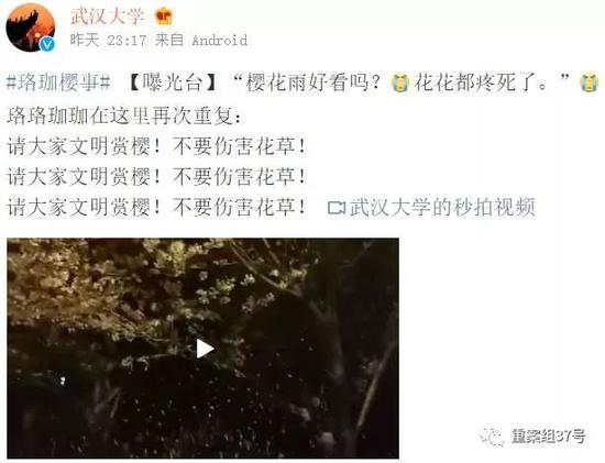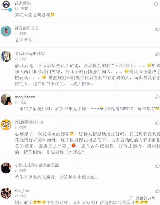 重案組37號(微信ID:zhonganzu37)發現,武漢大學官方微博開設“曝光臺”在近日連續公布了多幅反映游客不文明行為的圖片。包括折枝、爬樹、刻字、亂丟垃圾等,
