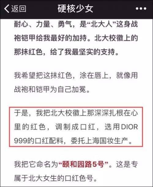 所以,她把這抹紅色做成了口紅,“選用DIOR999的口紅配色,委托上海國妝生產,命名為‘頤和園路5號’”,“這是專屬于北大女生的口紅色號”。