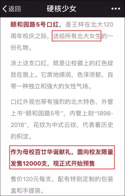 王女神說了,這是她在北大120周年校慶之際送給所有北大女生的禮物,一支120元,限量發售12000支……