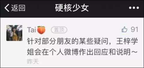 昨天文章還在的時候,公號留言說,王梓學姐會在個人微博針對質疑作出回應和說明。