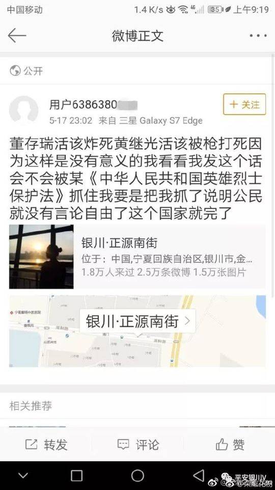 5月18日,銀川警方依法行政拘留一名侮辱英烈的網(wǎng)民。