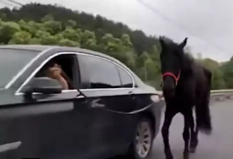 4月14日,在浙江金華,一男子駕駛著浙GV0***黑色寶馬車遛馬的視頻在網上廣泛熱傳,引發市民熱議。
