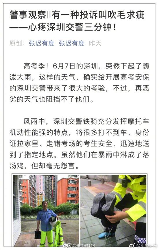 @北京青年報:[交警暴雨天護送考生反被投訴,@深圳交警 回應]