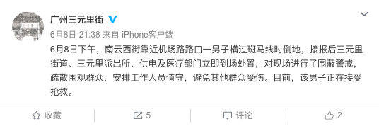 6月8日下午,南云西街靠近機(jī)場(chǎng)路路口一男子橫過(guò)斑馬線時(shí)倒地,接報(bào)后三元里街道、三元里派出所、供電及醫(yī)療部門(mén)立即到場(chǎng)處置,對(duì)現(xiàn)場(chǎng)進(jìn)行了圍蔽警戒,疏散圍觀群眾,安排工作人員值守,避免其他群眾受傷。