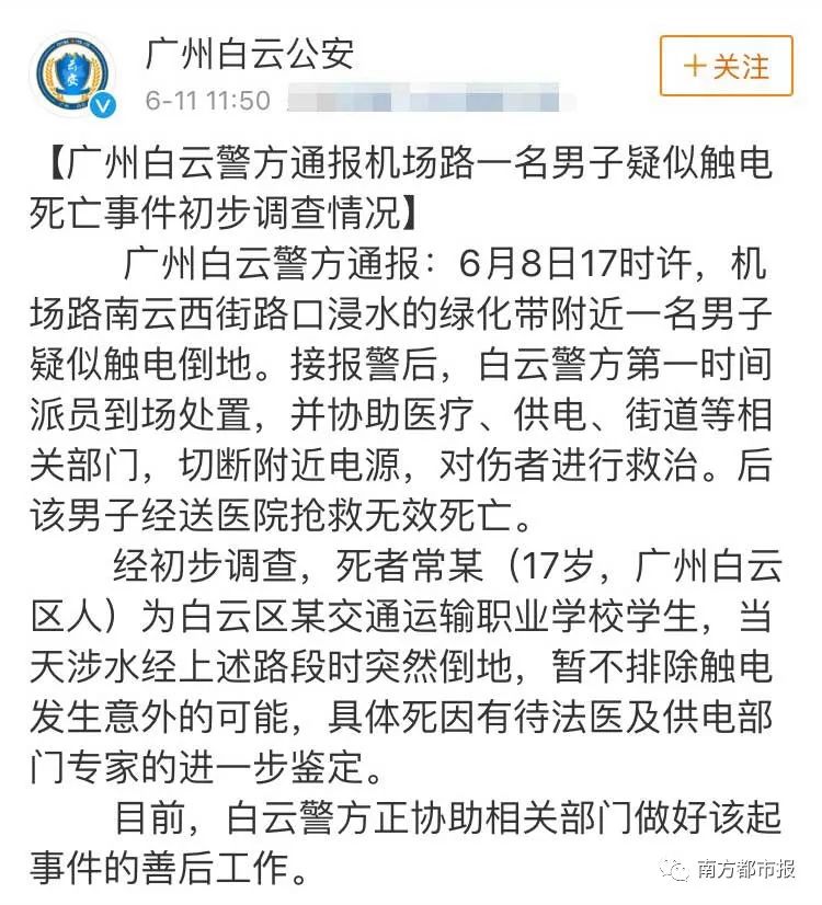 廣州白云警方今早11:50發(fā)布通報(bào):暫不排除觸電發(fā)生意外的可能,具體死因有待法醫(yī)及供電部門(mén)專家的進(jìn)一步鑒定。
