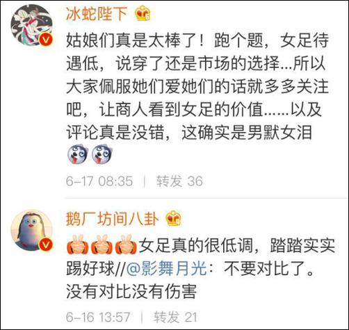 轉發量最高的評論,是呼吁人們多多關注女足。希望女足姑娘們,能得到與成績相匹配的待遇和關注度。