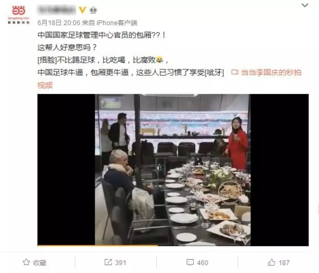 6月18日,網(wǎng)絡(luò)上有人曬出名帥米盧和幾位中國(guó)人在世界杯的包廂內(nèi)用餐的視頻,并稱足球管理中心官員伙同米盧在世界杯豪華包廂大吃大喝。一時(shí)間,足協(xié)又被推到了風(fēng)口浪尖。?