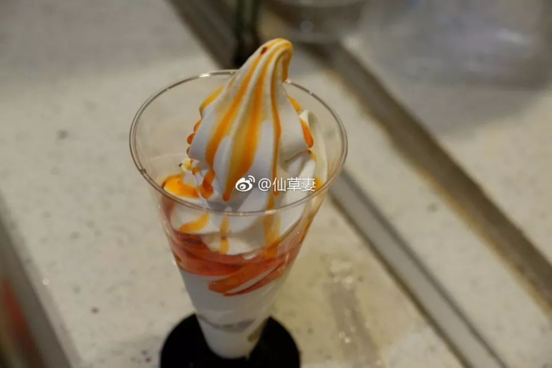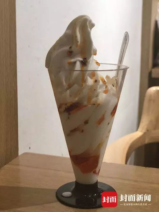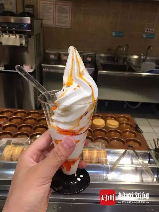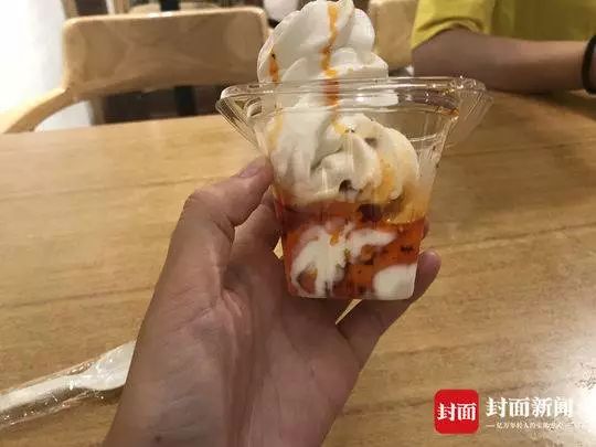這個冰淇淋從外觀上來看和普通冰淇淋沒什么區別,就是用杯裝或蛋卷裝的冰激凌,但關鍵是,它會在冰淇淋上淋上一勺紅油,讓紅油滲透進冰激凌。
