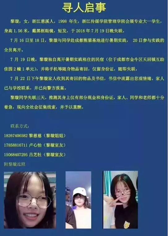 19日晚,黎璇同學獨自離開位于成都市金牛區天回鎮互助佳園2幢1單元,暑期實踐同學們所住的民宿;并將手機等隨身物品和一封書信寄回自己家中,留下了身份證,隨即失聯。