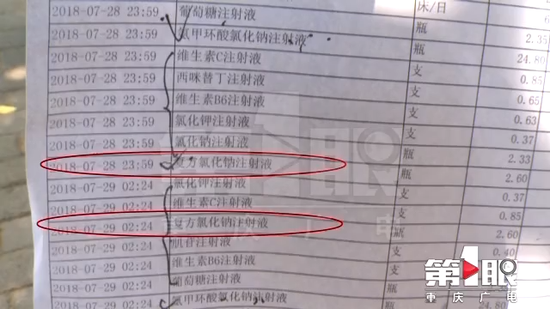包裝上明確標明,生產日期是2016年6月21日,有效期至2018年5月。從費用明細上可以看到,楊大爺分別于28日23點59分和29日凌晨2點24分,在沙魚鎮衛生院,兩次使用了這種復方氯化鈉注射液。隨后,朱先生返回衛生院,在垃圾桶里找到了一瓶復方氯化鈉注射液,瓶身上的信息表明,這就是楊大爺注射過的藥瓶,而這一瓶,有效期同樣是2018年5月。