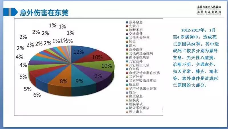 而該院統(tǒng)計(jì)的2012~2017年收治的1~4歲病例中造成死亡的原因共24種,意外窒息占12%排在首位,交通意外9%,溺水6%,意外跌落5%,其他意外2%,意外傷害總共占了34%。
